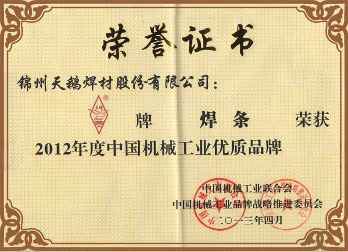 中國(guó)機(jī)械工業(yè)優(yōu)質(zhì)品牌證書